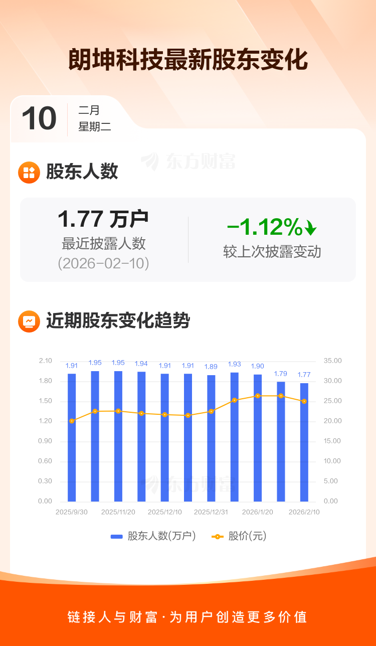 朗坤科技最新披露数据显示,截至2月10日公司股东户数为1.77万户,较上期(2026年1月30日)减少200户,降幅为1.12%。户均持有流通股数量由上期的6899股上升至6976股,户均持股金额由上期的18.17万元减少至17.42万元。