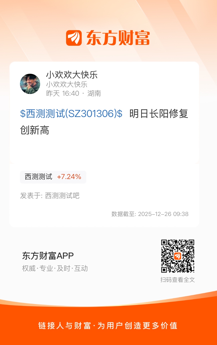 $西测测试(SZ301306)$  明日长阳修复创新高