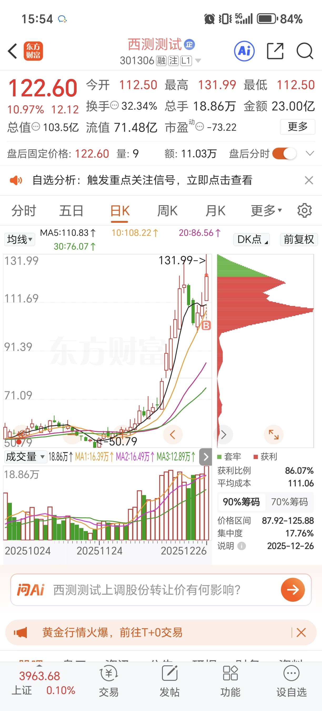$西测测试(SZ301306)$ 昨天尾盘差几分钱没买到,吸取教训,走势符合我的交易模式尾盘干!