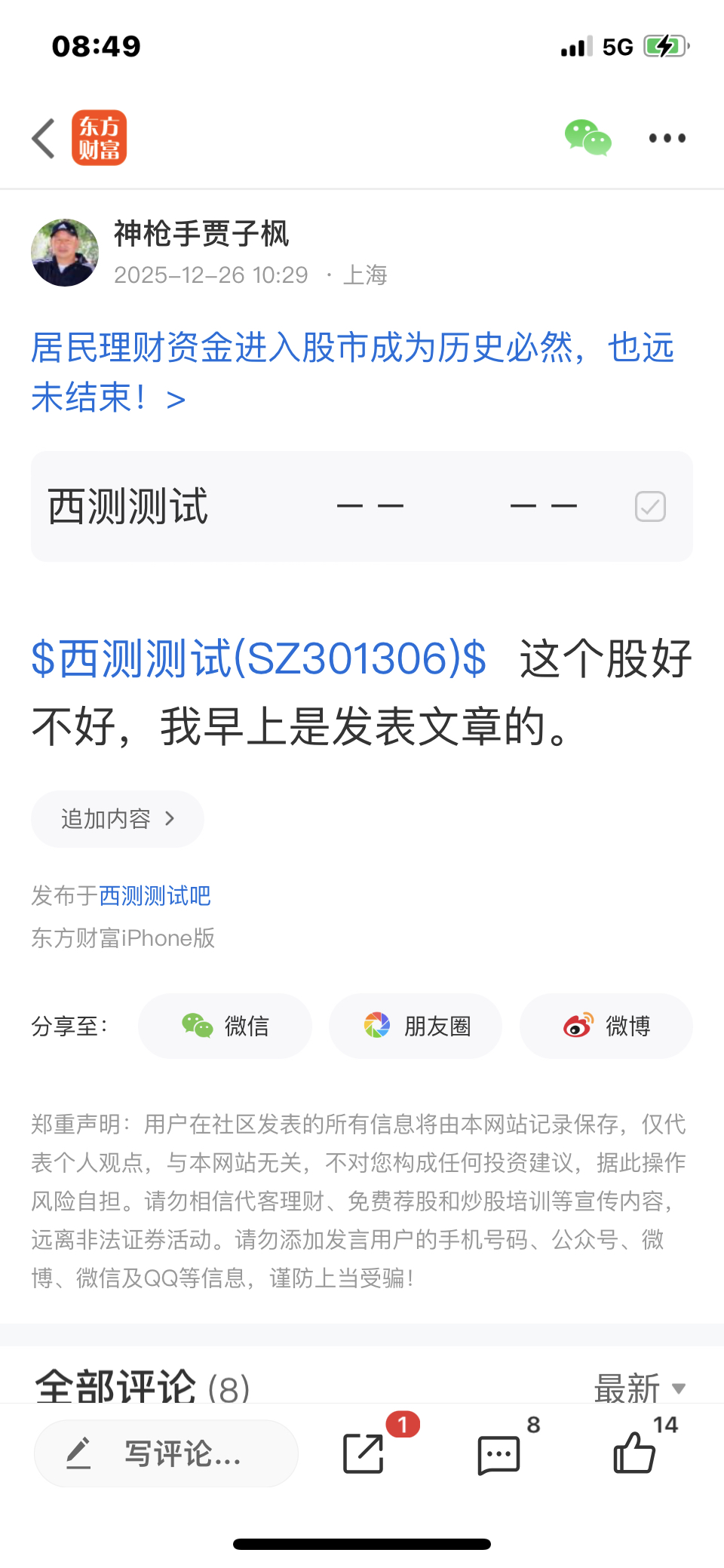 $西测测试(SZ301306)$ 这个是我十二月二十六号发表文章看好的股票,大家可以看我当时的文章,
