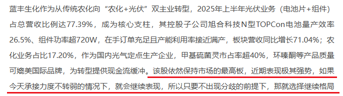 $蓝丰生化(SZ002513)$ 作为从传统农化向“农化+光伏”双主业转型,2025年上半年光伏业务(电池片+组件)占总营收比例达77.39%,成为核心支柱,其控股子公司旭合科技N型TOPCon电池量产效率26.5%、组件功率超720W,在手订单充足且产能利用率接近满产,板块营收同比增长71.04%;农化业务占比17.20%,作为国内光气定点生产企业,甲基硫菌灵市占率超40%,环嗪酮等产品质量可媲美国际品牌,为转型提供现金流缓冲。该股作为市场最靓的仔,集合竞价也没有出现转弱的迹象,完全是被市场资金硬怼上去的,可以说表现得极其完美,在这种情况下,必须是格局持有,从今天这种情况来看,分歧概率是要往后靠了