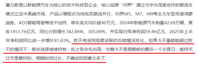 $赛力斯(SH601127)$ 是以新能源汽车为核心的技术科技型企业,核心品牌“问界”通过与华为深度合作的智选车模式立足中高端市场,产品以增程式与纯电双路线并行,问界M5、M7、M9等主力车型凭借鸿蒙座舱、ADS智能驾驶等技术加持,单车成交均价超40万元,2024年新能源汽车销量42.69万辆、营收1451.76亿元,同比分别增长182.84%、305.04%,并实现归母净利润59.46亿元,2025年上半年净利润同比进一步增长81.03%。该股今天表现的极其强势,一致处于震荡上行,昨天在剑桥科技与赛力斯这两者之间,选择了去弱留强(综合各方面情况作出选择),现在来看这个选择是完全正确的,无论是板块还是个股本身,都是具有优势的一面,所以选择继续持有