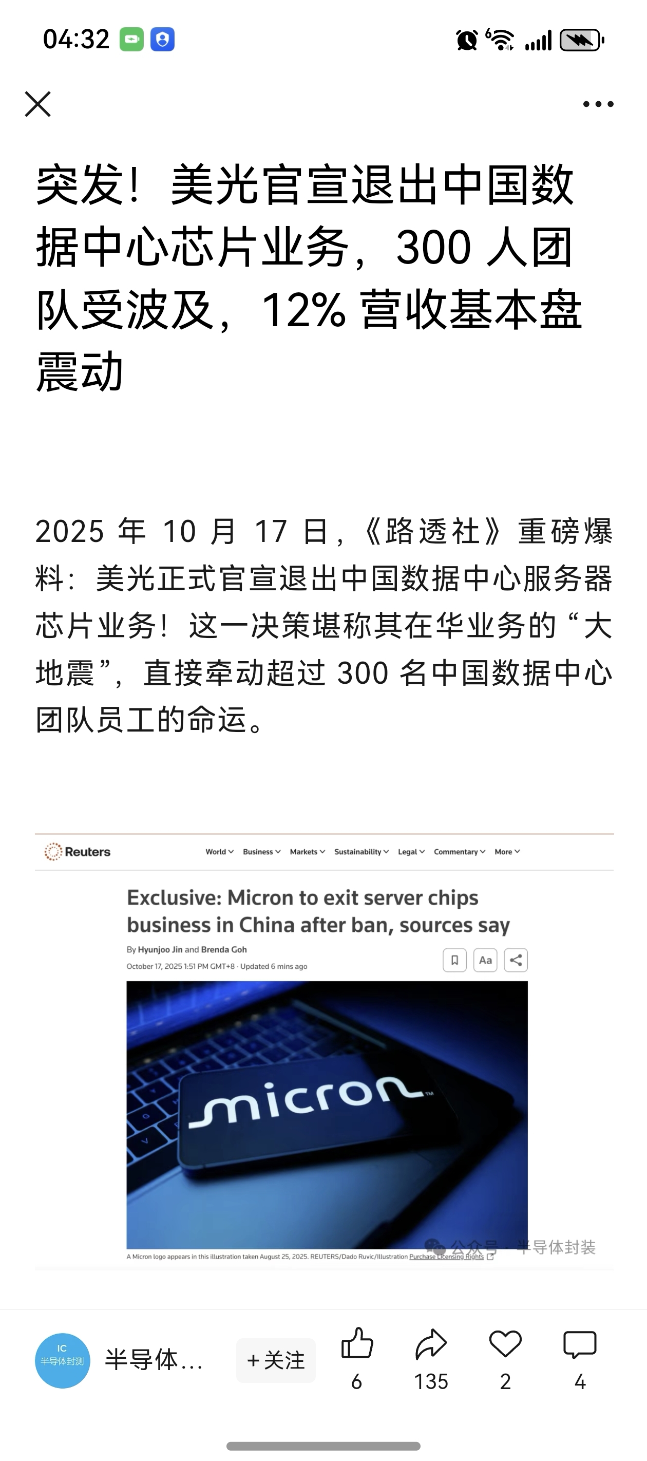 重磅!根据最新的路透社新闻,美光退出中国数据中心芯片业务!美光退出部分移动存储市
