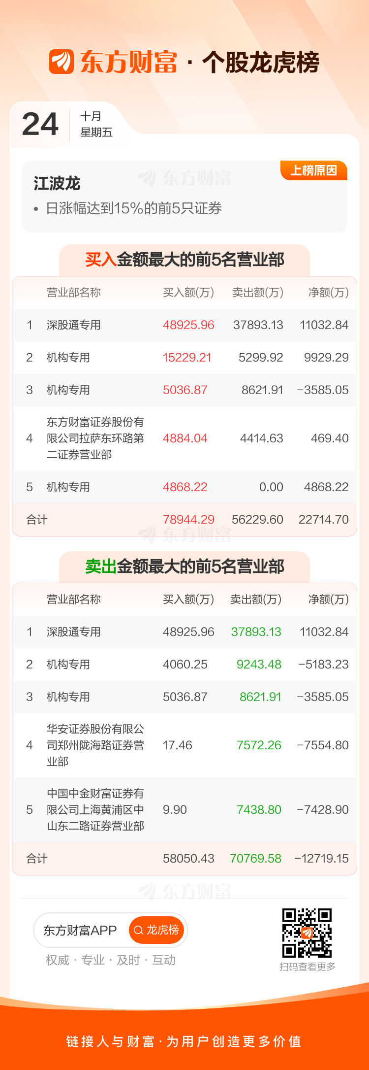 交易所2025年10月24日公布的交易公开信息显示,江波龙因成为日涨幅达到15%的前5只证券上榜。江波龙当日收报222元,涨跌幅16.73%,偏离值16.73%,换手率10.63%,成交额61.01亿。