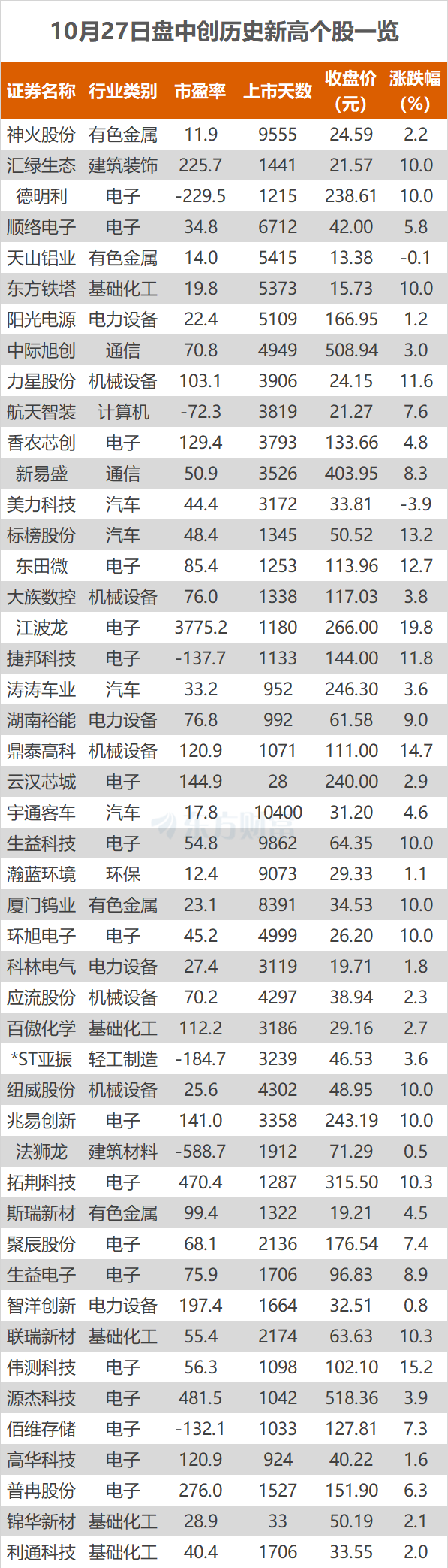 10月27日,A股三大指数今日延续强势表现,沪指逼近4000点大关。截止收盘,沪指涨1.18%,收报3996.94点;深证成指涨1.51%,收报13489.40点;创业板指涨1.98%,收报3234.45点。东方财富Choice数据显示,今日有47只个股盘中股价创历史新高,分别为江波龙、兆易创新等。