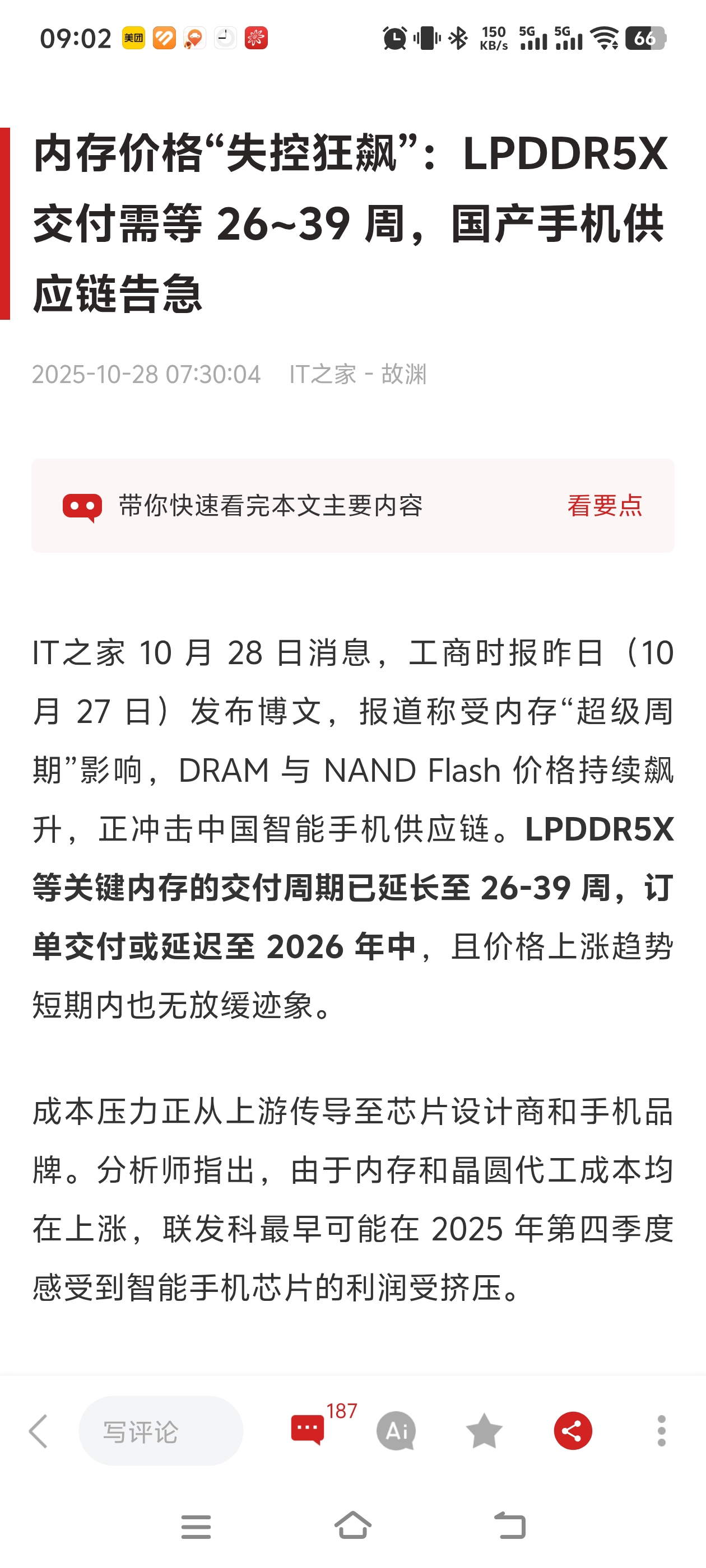 内存价格“失控狂飙”:LPDDR5X 交付需等 26~39 周,国产手机供应链告急