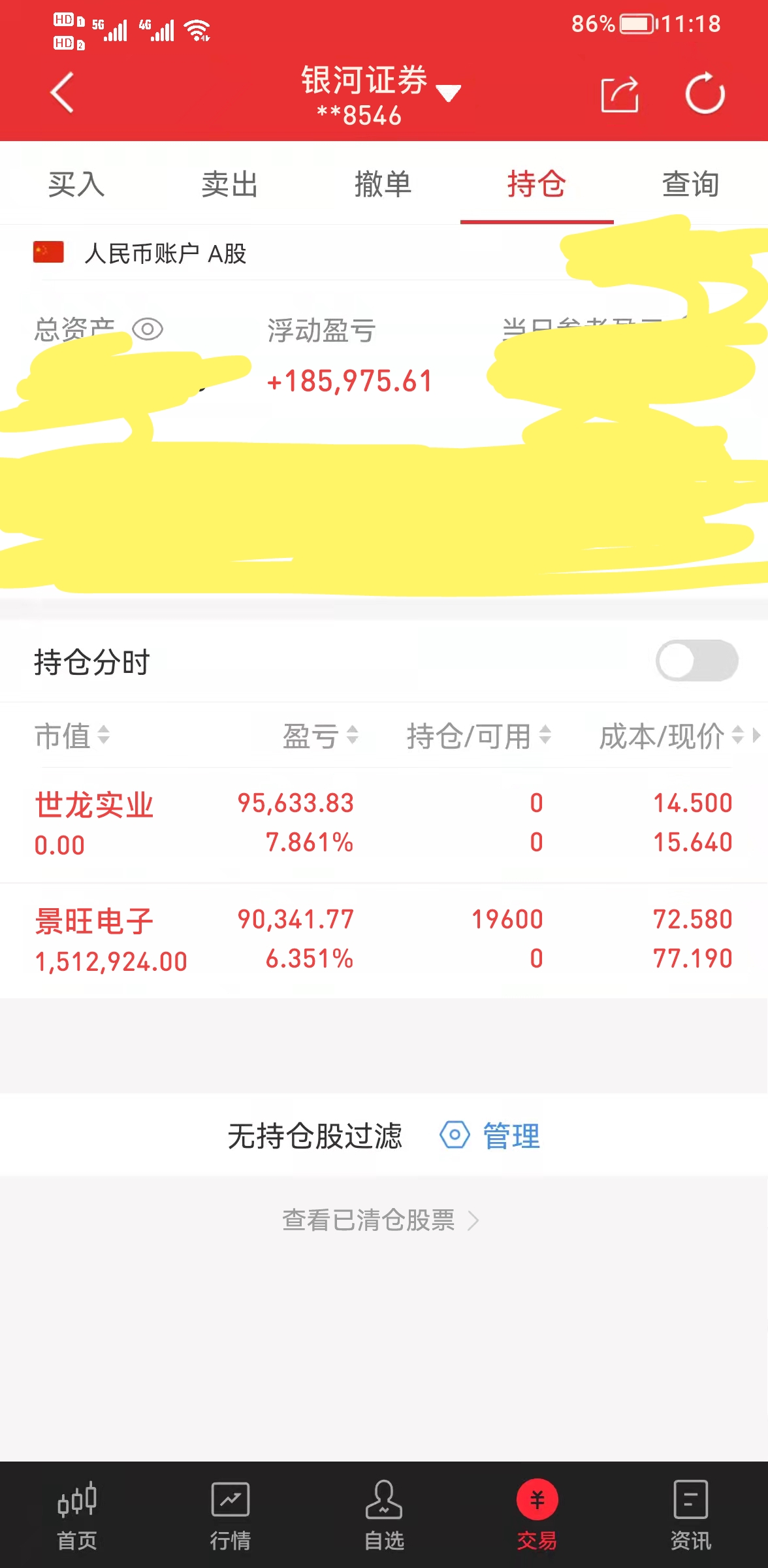 大家上午好,今日给世龙实业给落袋为安了,早上新介入的景旺电子还不错强势涨停了,期