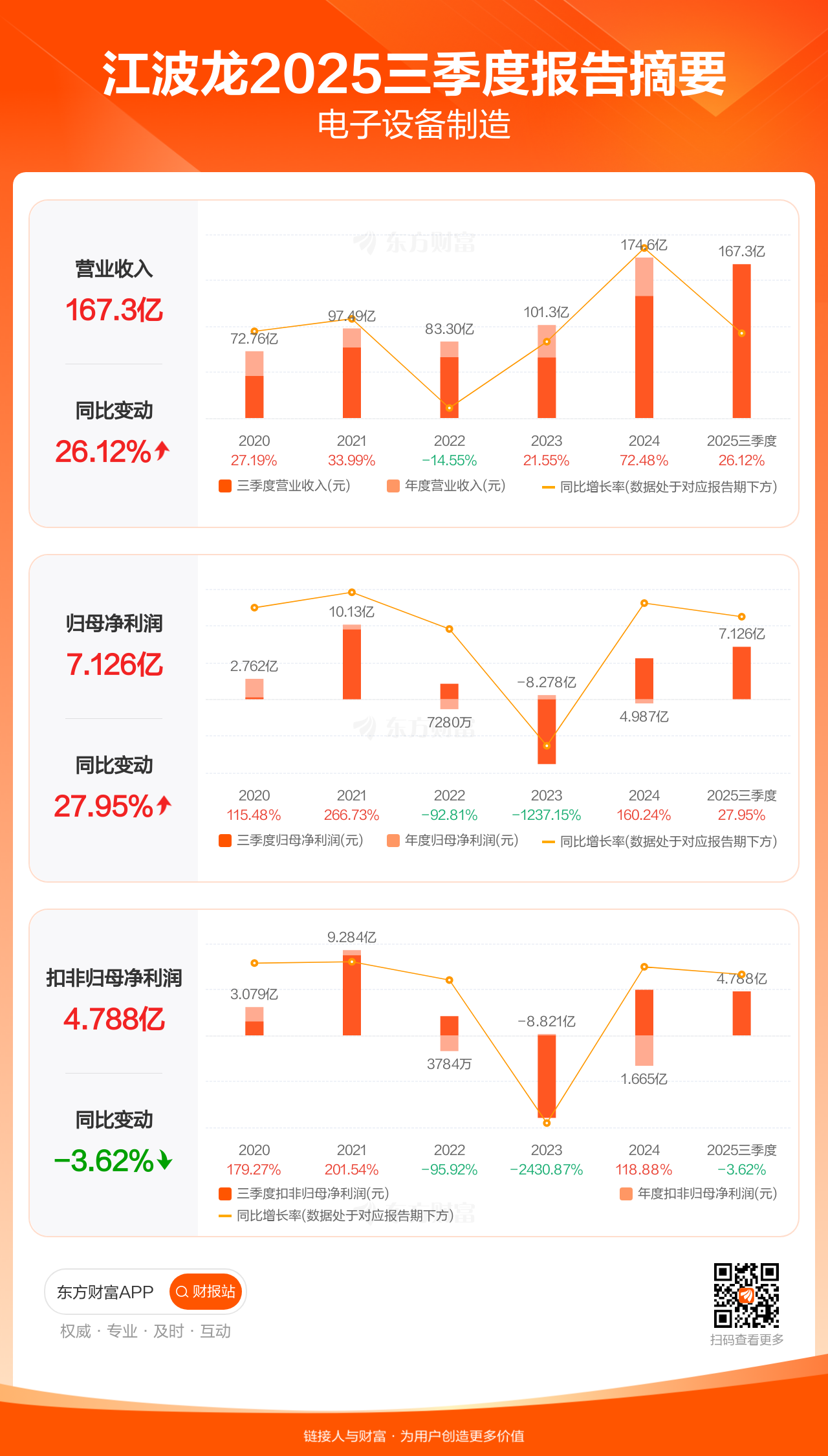 江波龙10月30日发布2025年三季报显示,公司前三季实现营业收入167.34亿元,同比增长26.12%;归母净利润7.13亿元,同比增长27.95%;扣非归母净利润4.79亿元,同比下滑3.62%。