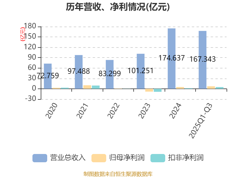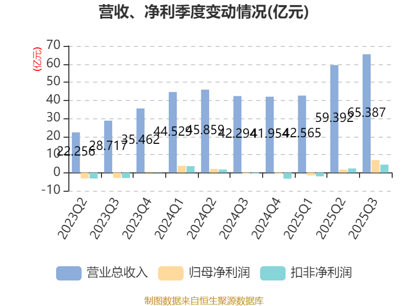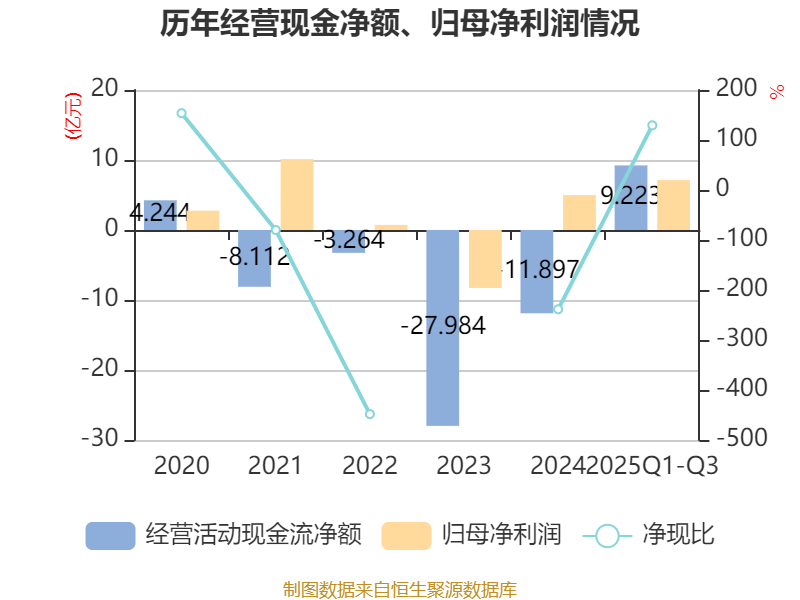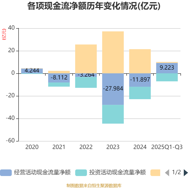 2025年前三季度,公司经营活动现金流净额为9.22亿元,同比增加20.28亿元;筹资活动现金流净额8494.04万元,同比减少20.7亿元;投资活动现金流净额-7.11亿元,上年同期为-8.8亿元。