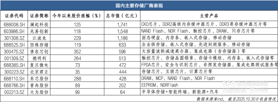 - 被认为是国内“存储一哥”的兆易创新(603986.SH)逐步从低端NOR Flash产品拓展到NAND Flash和全线利基型DRAM产品,并向MCU(微控制单元)延伸,目前MCU在消费电子、新能源汽车等领域均有应用。近两个月股价走出“脉冲式”增长,截至10月28日收盘,已增长至246.95元/股,突破历史最高值。
