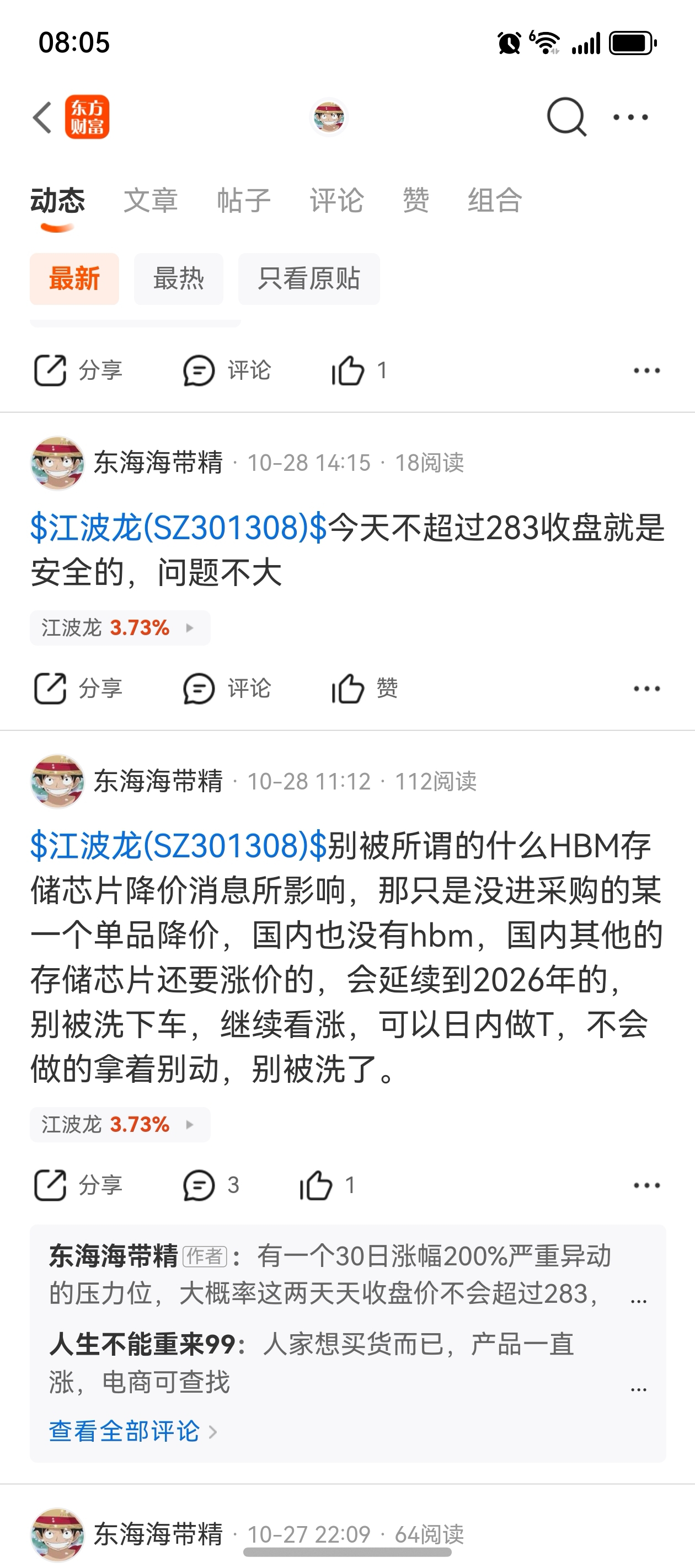 $江波龙(SZ301308)$ 兄弟们,让你们轻点干,咋这么猛干啥,严异了吧,我前天说的283,今天咋一分不差的收在283,要回踩均线了,轻点踩踏,回踩均线可以再买回来,买高的可以低吸做题,中期来看,不会套人,还会有新高。