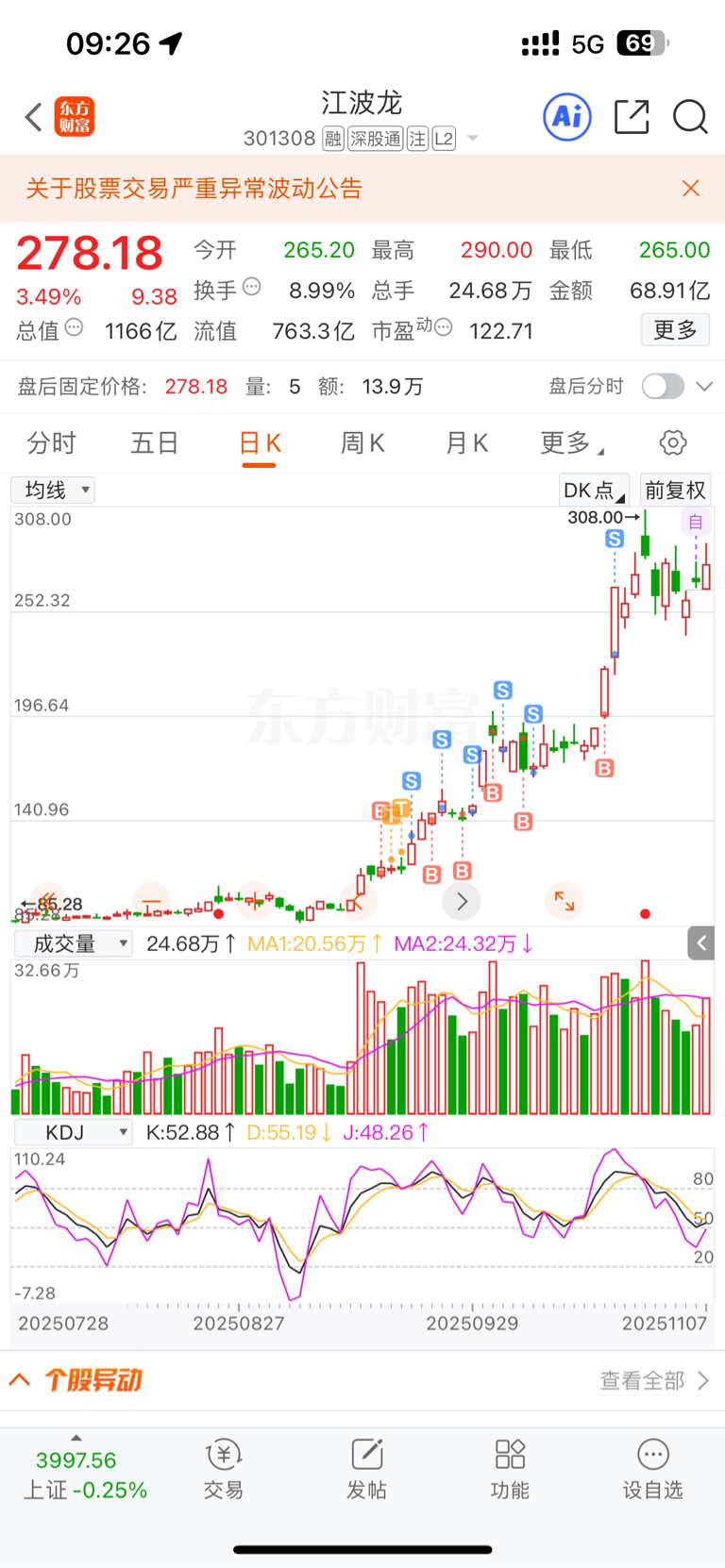 $江波龙(SZ301308)$ 江波龙,国产存储核心,拥有自主研发能力的完整产业链,有大量存储库存,买于刚刚启动时,到高点差不多接近三倍,但我只赚了几十个点,也卖飞了很多个点,从27号当日卖飞15个点后因为接近监管就没有再介入了,香农也强,但香农是负责销售代理的,存储板块基本被美国闪迪和美光绑架,美股涨就跟着涨,晚上观察美股就知道第二天的走势,不过高开低走成了常事,对于江波龙应该还有预期,但切记要低吸,不要追高,低点的时候买,高点的时候卖