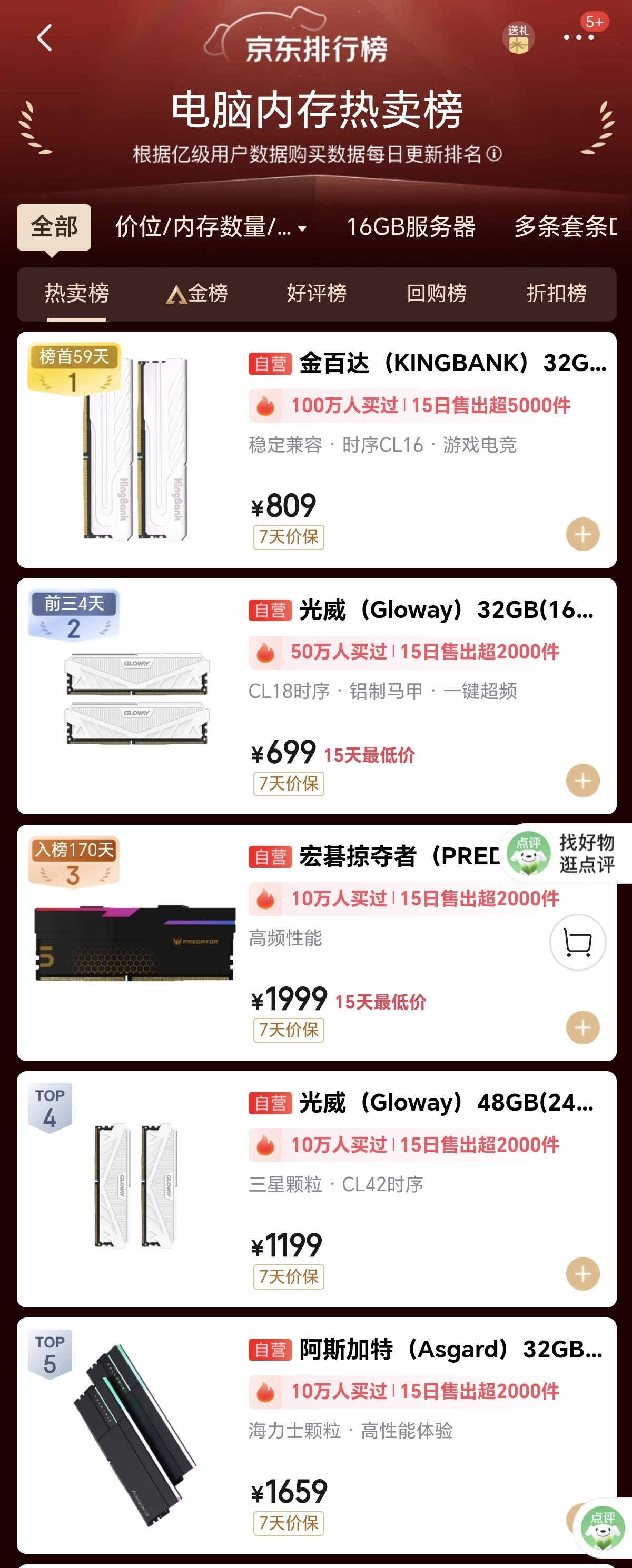 京东销量前5的内存,三个都是嘉合劲威旗下的,基金经理和游资大佬们都来抱团吧,70亿市值到500亿还有5倍空间
