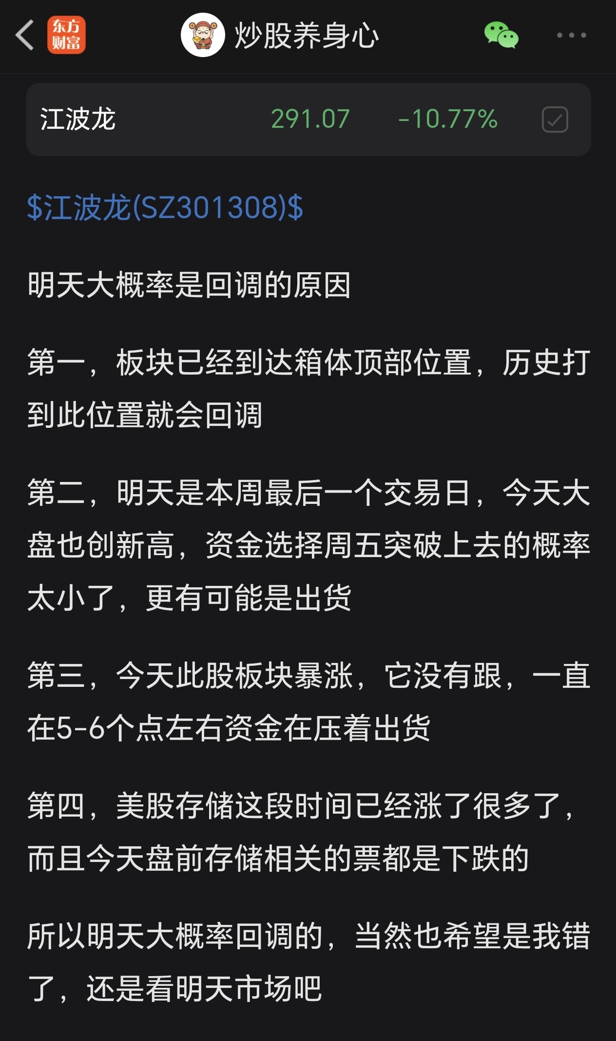 $江波龙(SZ301308)$ 昨天说了大概率会回调,下面一堆人还在喷,今天结果已经证明了吧!这波回调大概不会简单就结束,建议暂时还是以观望为主,等企稳了再说