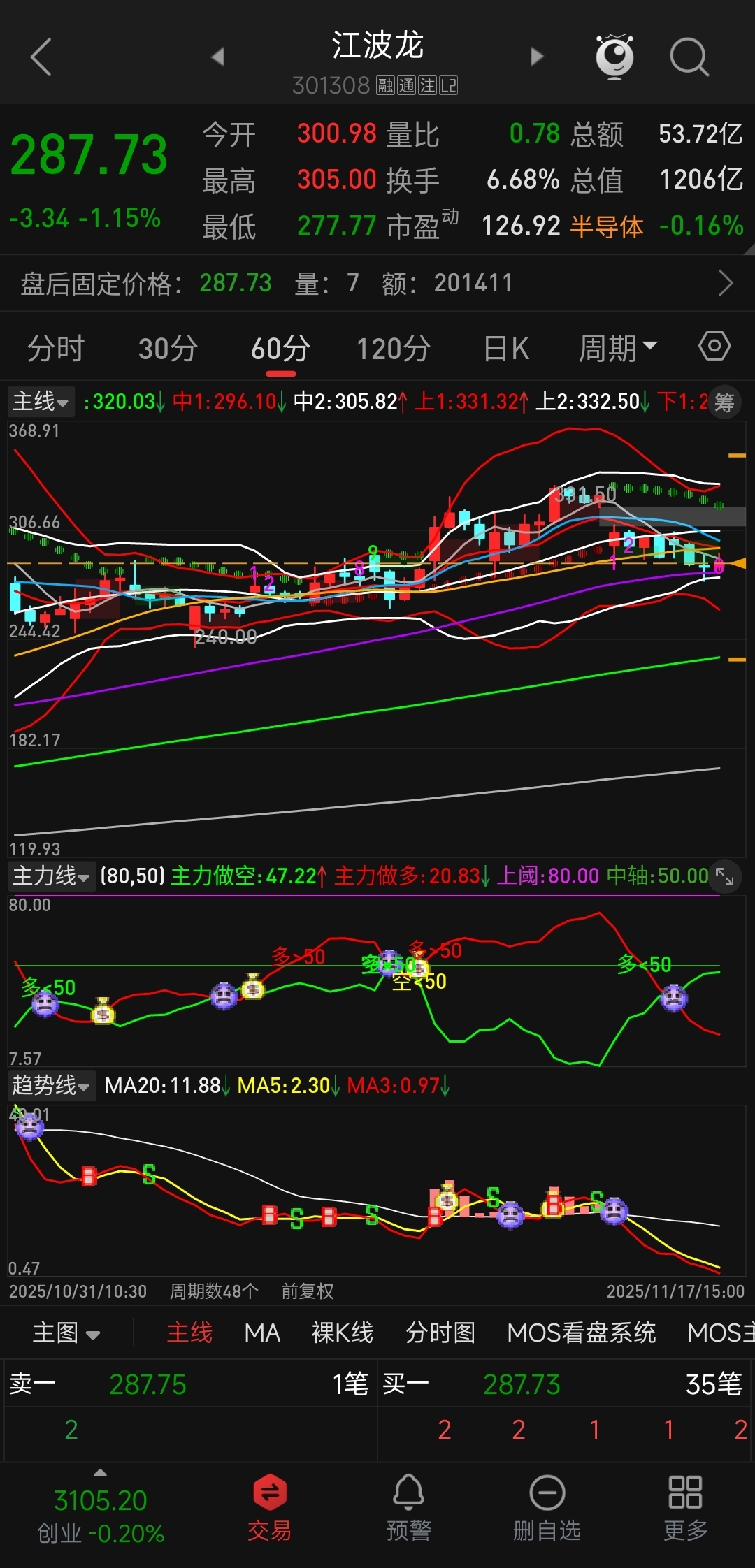60分钟线向下开口,主力线死叉后继续走弱,趋势线加速下行。