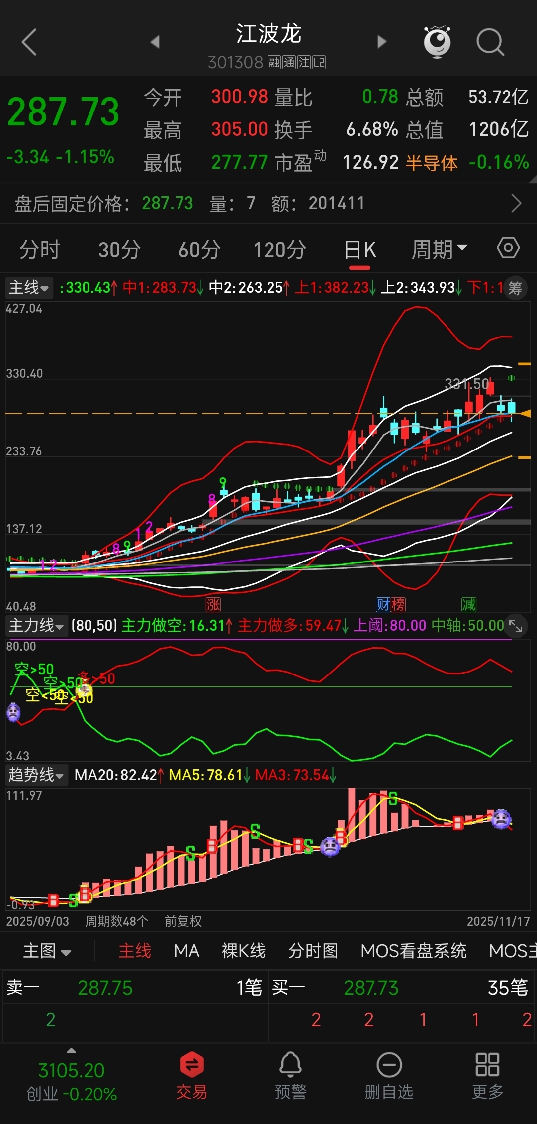 60分钟线向下开口,主力线死叉后继续走弱,趋势线加速下行。日线收口了,主力做多线