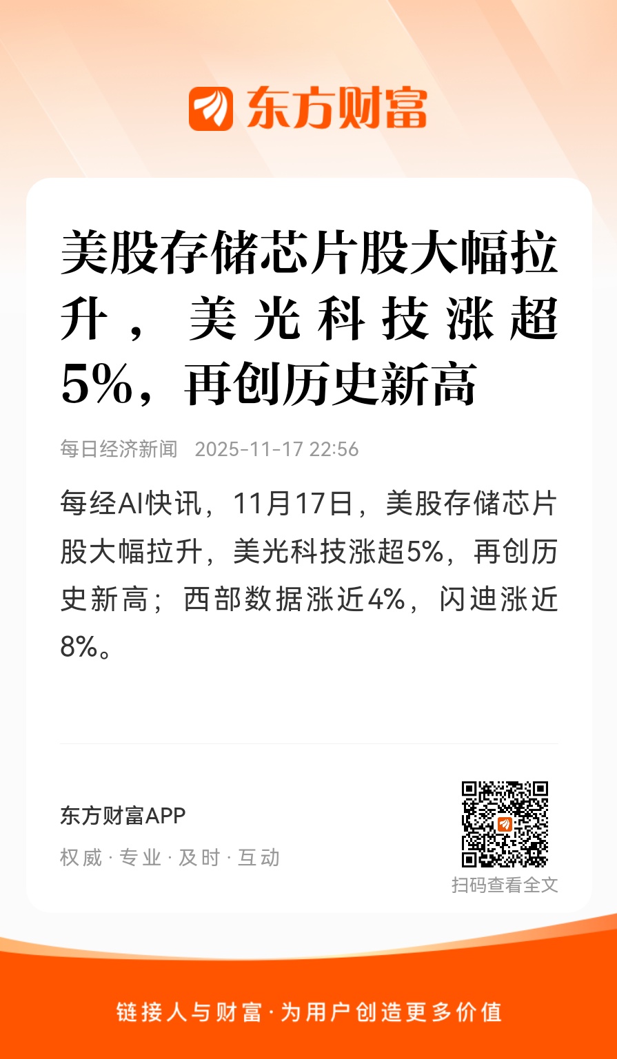 每经AI快讯,11月17日,美股存储芯片股大幅拉升,美光科技涨超5%,再创历史新高;西部数据涨近4%,闪迪涨近8%。