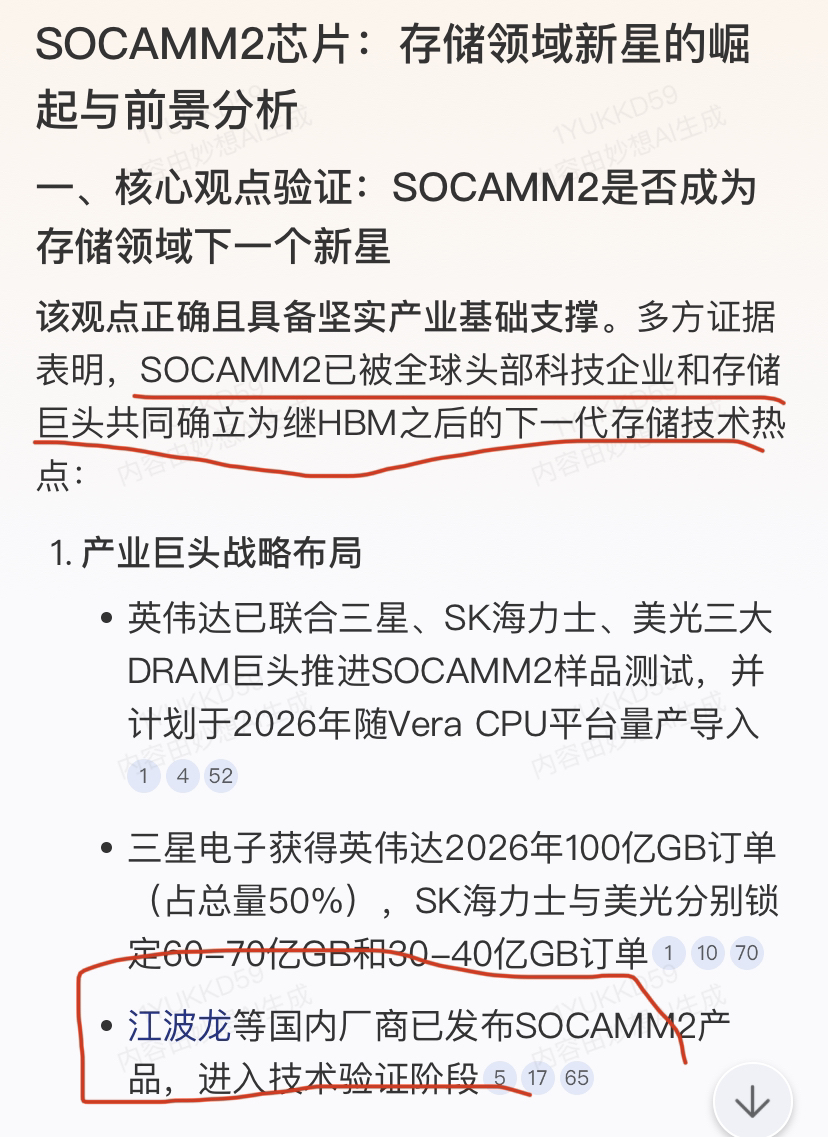 继HBM后,SOCAMM2被认为是AI存储芯片领域下一代新星,英伟达已经开始大量订购,全球仅有三家企业可以生产。国内,目前“江波龙”是唯一发布了这种新一代AI存储芯片的上市公司!