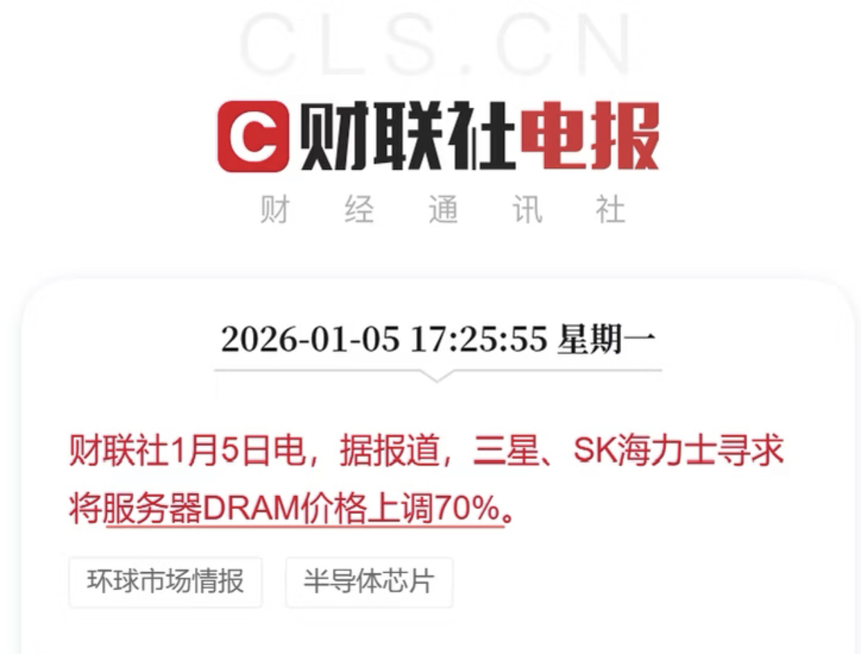 据报道,三星、SK海力士寻求将服务器DRAM存储芯片价格上调70%。(财联社)