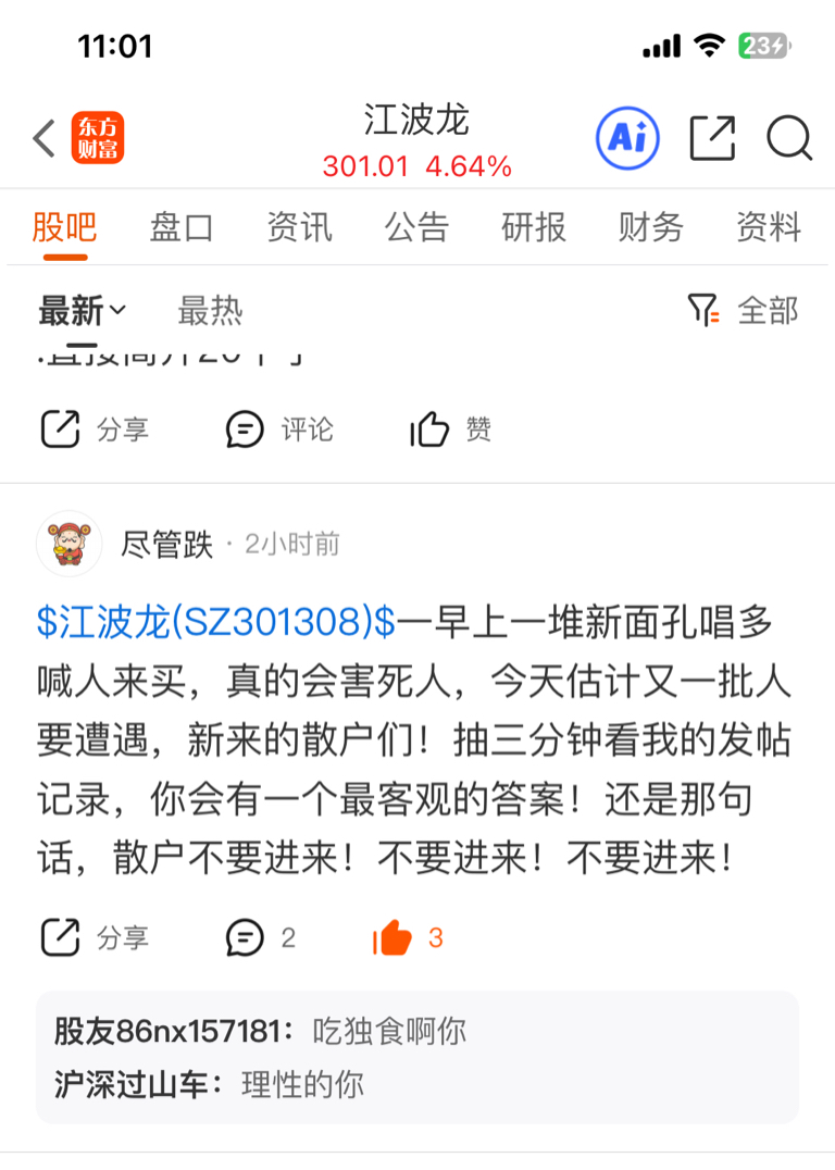 温馨提示: 1.根据《证券法》规定,禁止编造、传播虚假信息或者误导性信息,扰乱证券市场;2.用户在本社区发表的所有资料、言论等仅代表个人观点,与本网站立场无关,不对您构成任何投资建议。用户应基于自己的独立判断,自行决定证券投资并承担相应风险。《东方财富社区管理规定》