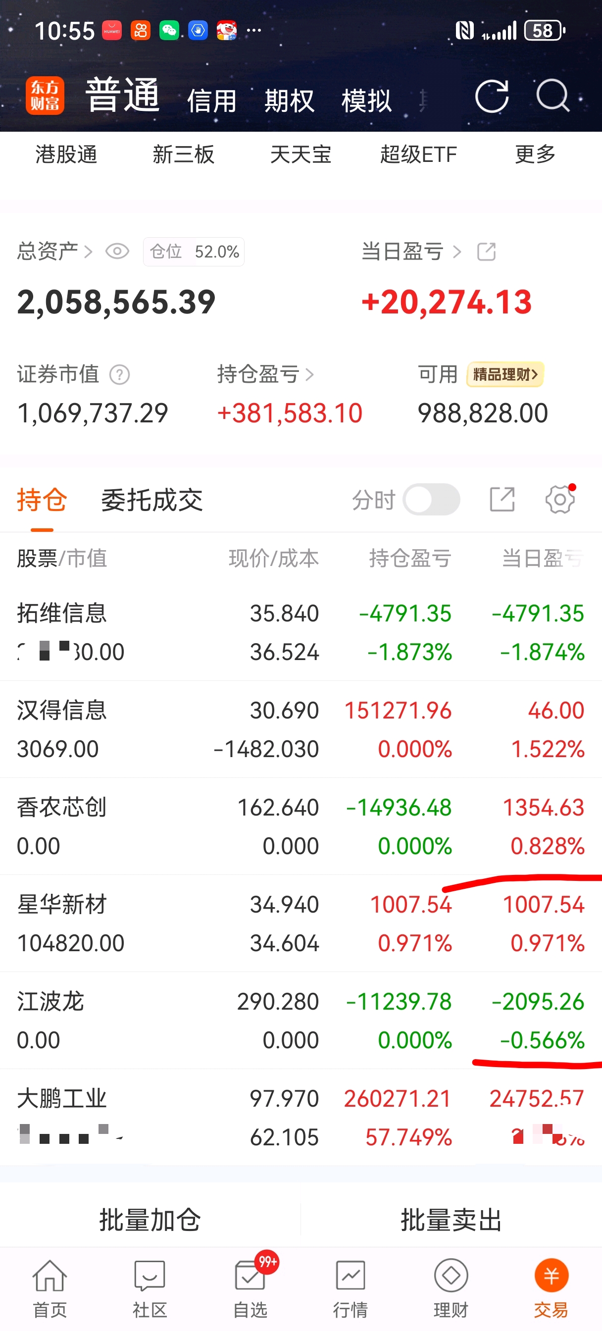 今天的操作自己都笑了,昨天就三只票,江波龙,香农芯创,大鹏,今天最差的都红了6个点以上,我竟然亏钱了,下午本来想小仓位买只票9万块的,股数竟然多加了个0,竟然买成了90万,明天希望不要直接被坑了