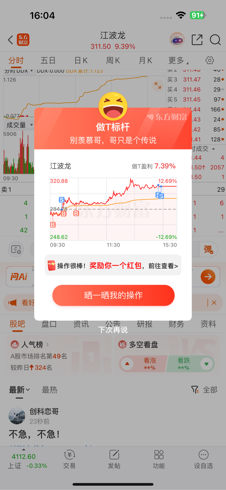 $江波龙(SZ301308)$ 昨天就说今天全仓江波龙,早上还说今天看到325,可惜差几元,睡醒起来又T的,明天有涨停欲望。