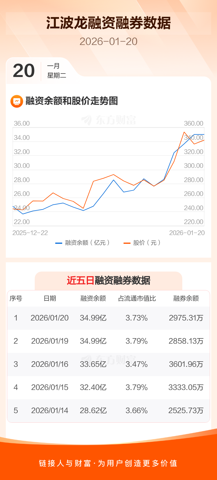 交易所最新数据显示,江波龙于2026年1月20日获融资买入9.66亿元,融资偿还9.66亿元,当日融资净买入22.11万元。目前,该股融资余额34.99亿,占流通市值比例为3.73%。