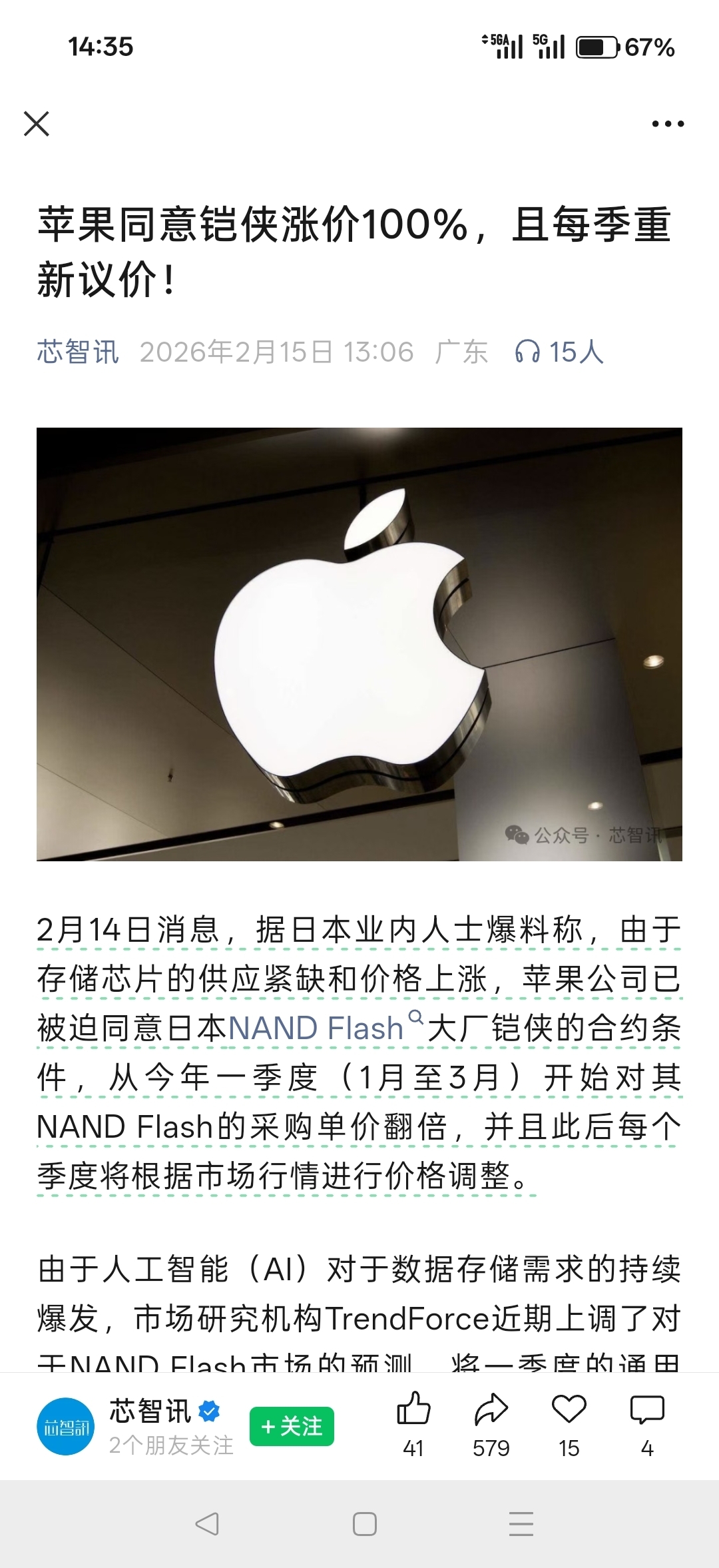 苹果同意铠侠涨价100%,且每季重新议价!芯智讯2026年2月15日13:06广