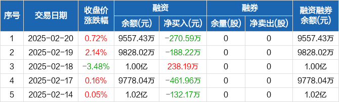 昆船智能:融资净偿还270.59万元,融资余额9557.43万元(02-20)