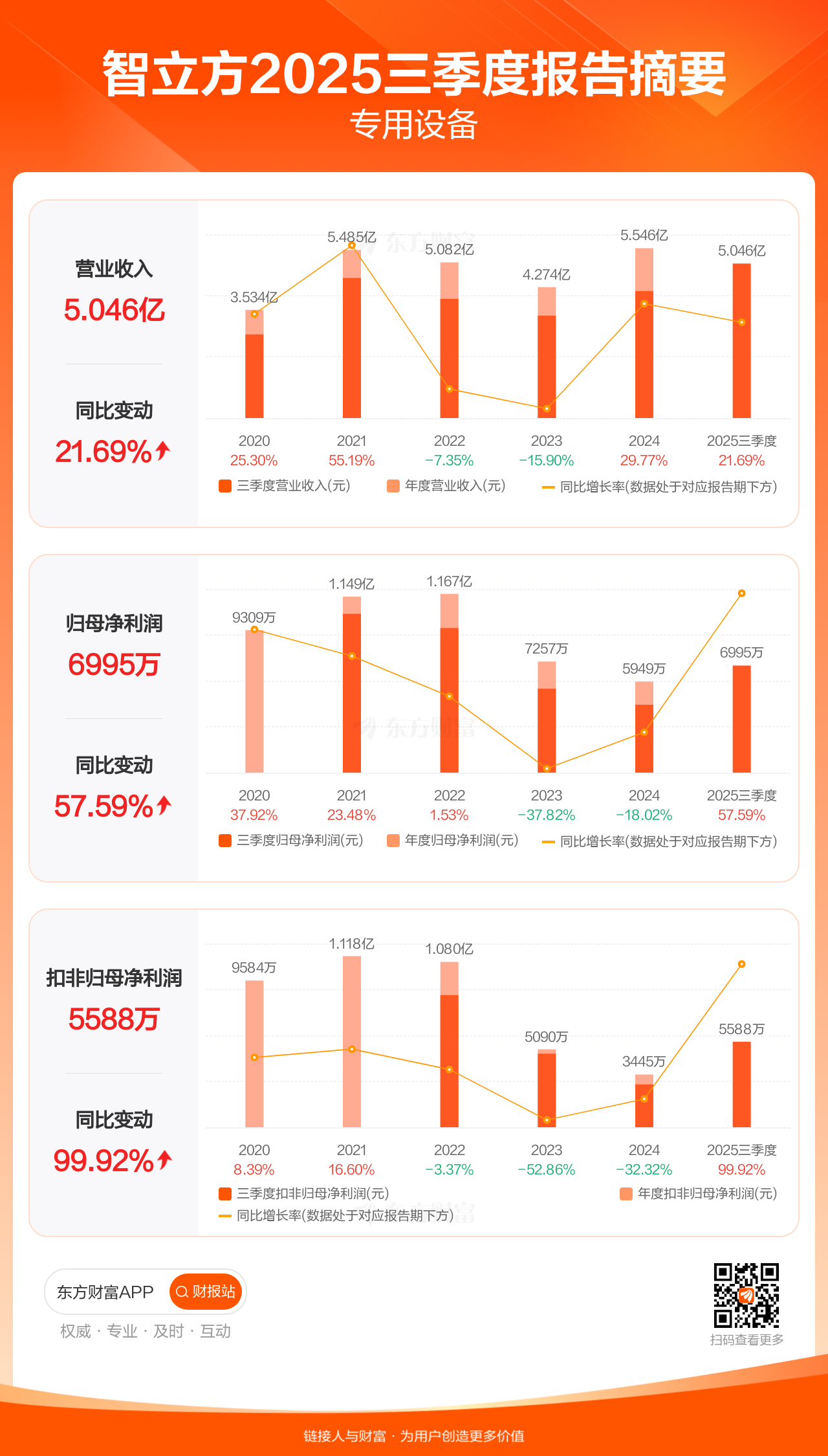 智立方10月30日发布2025年三季报显示,公司前三季实现营业收入5.05亿元,同比增长21.69%;归母净利润6995.40万元,同比增长57.59%;扣非归母净利润5587.57万元,同比增长99.92%。
