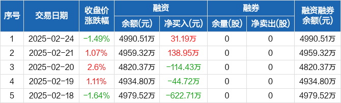 鑫磊股份:融资净买入31.19万元,融资余额4990.51万元(02-24)