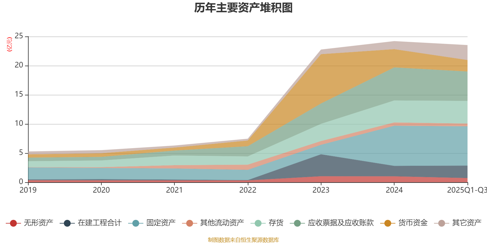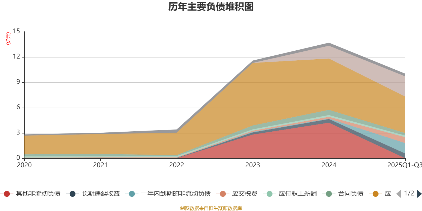 负债重大变化方面,截至2025年三季度末,公司其他非流动负债较上年末减少100%,占公司总资产比重下降17.4个百分点;应付票据及应付账款较上年末减少28.87%,占公司总资产比重下降6.73个百分点;一年内到期的非流动负债较上年末增加1955.05%,占公司总资产比重上升5.02个百分点;短期借款较上年末增加56.91%,占公司总资产比重上升3.88个百分点。