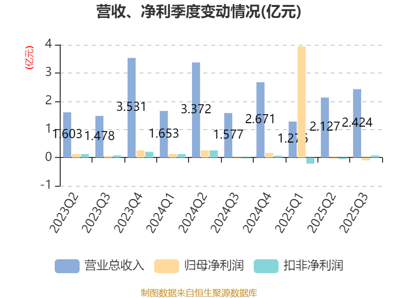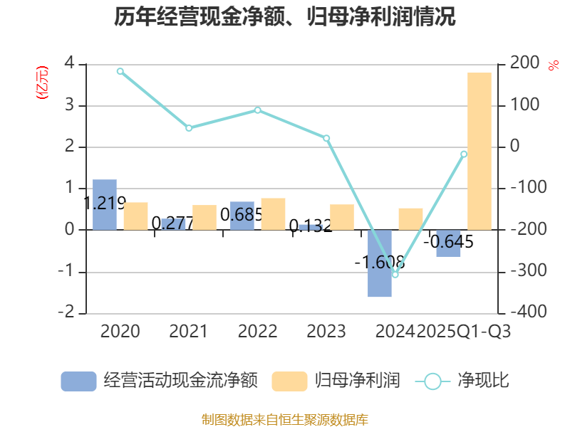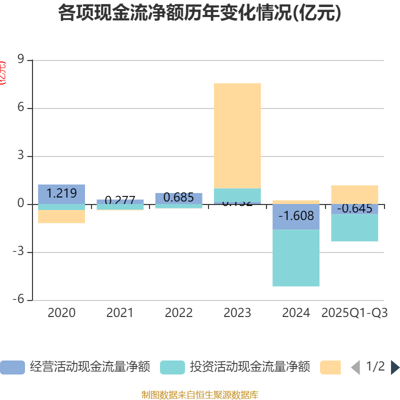 2025年前三季度,公司经营活动现金流净额为-6451.59万元,同比增加6812.95万元;筹资活动现金流净额1.16亿元,同比增加1.39亿元;投资活动现金流净额-1.69亿元,上年同期为-3.03亿元。