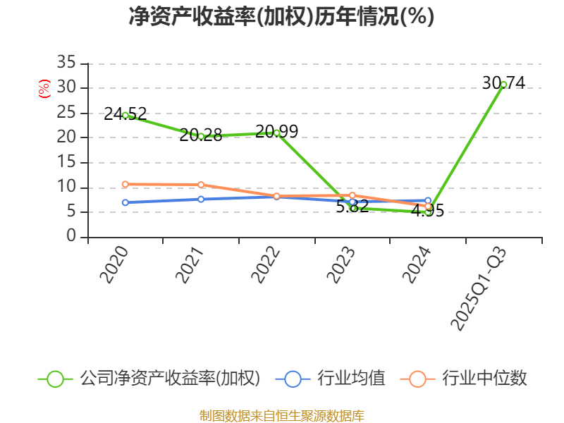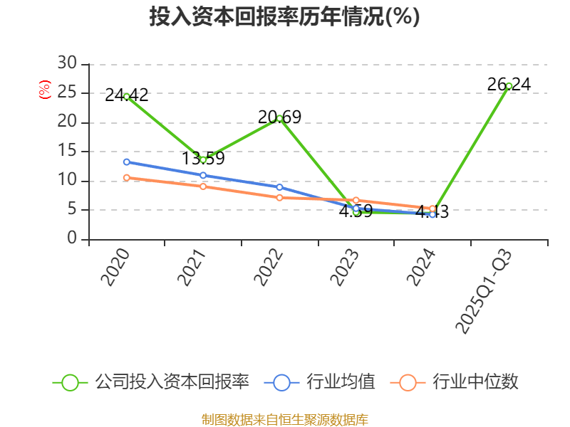 盈利能力方面, 2025年前三季度公司加权平均净资产收益率为30.74%,同比上升27.38个百分点。公司2025年前三季度投入资本回报率为26.24%,较上年同期上升23.9个百分点。