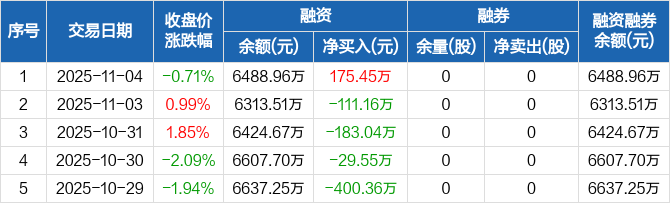 豪江智能:融资净买入175.45万元,融资余额6488.96万元(11-04)