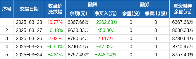 翰博高新:融资净偿还2262.68万元,融资余额6367.66万元(03-28)