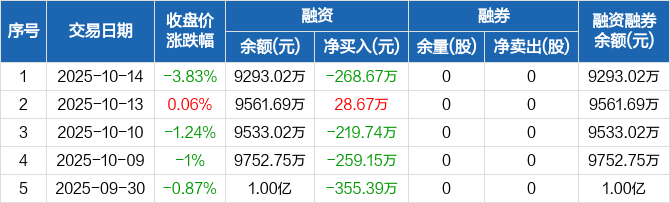 翰博高新:融资净偿还268.67万元,融资余额9293.02万元(10-14)