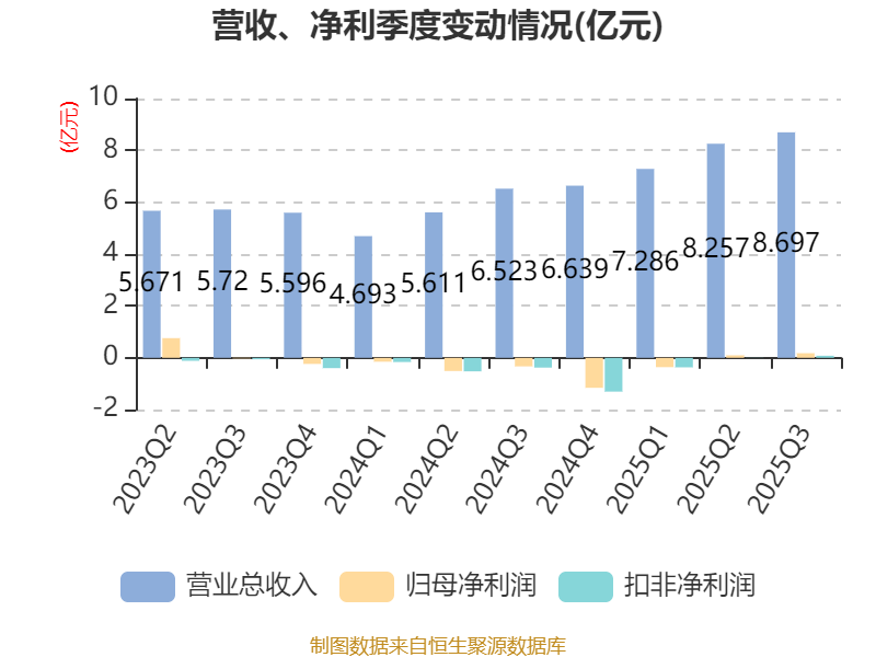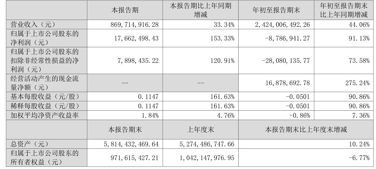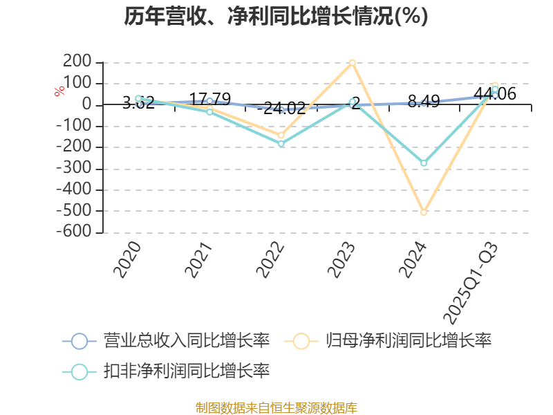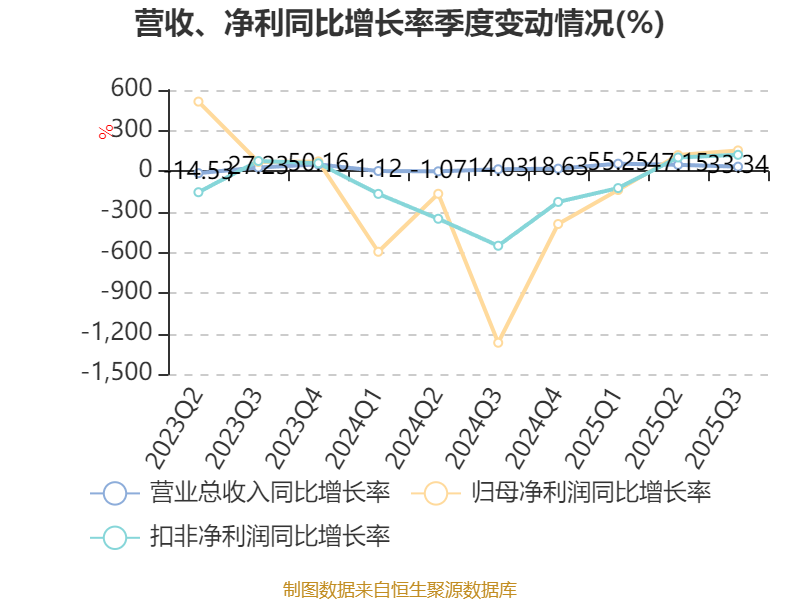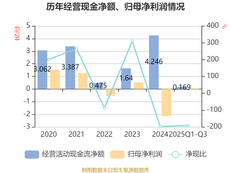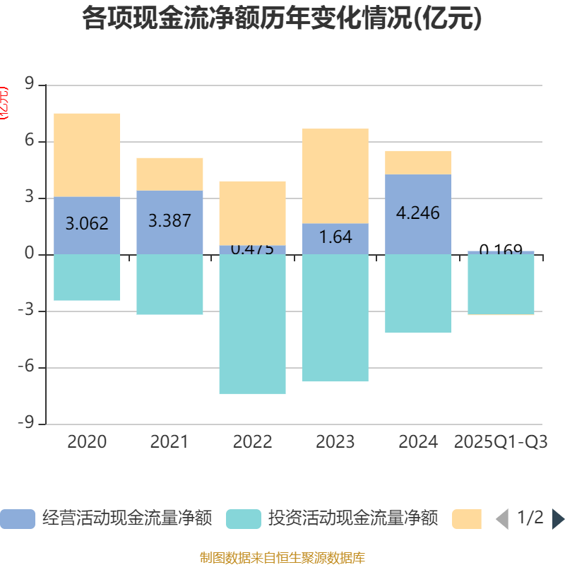 2025年前三季度,公司经营活动现金流净额为1687.87万元,同比增加2651.06万元;筹资活动现金流净额-333.24万元,同比减少6728.55万元;投资活动现金流净额-3.19亿元,上年同期为-7443.03万元。