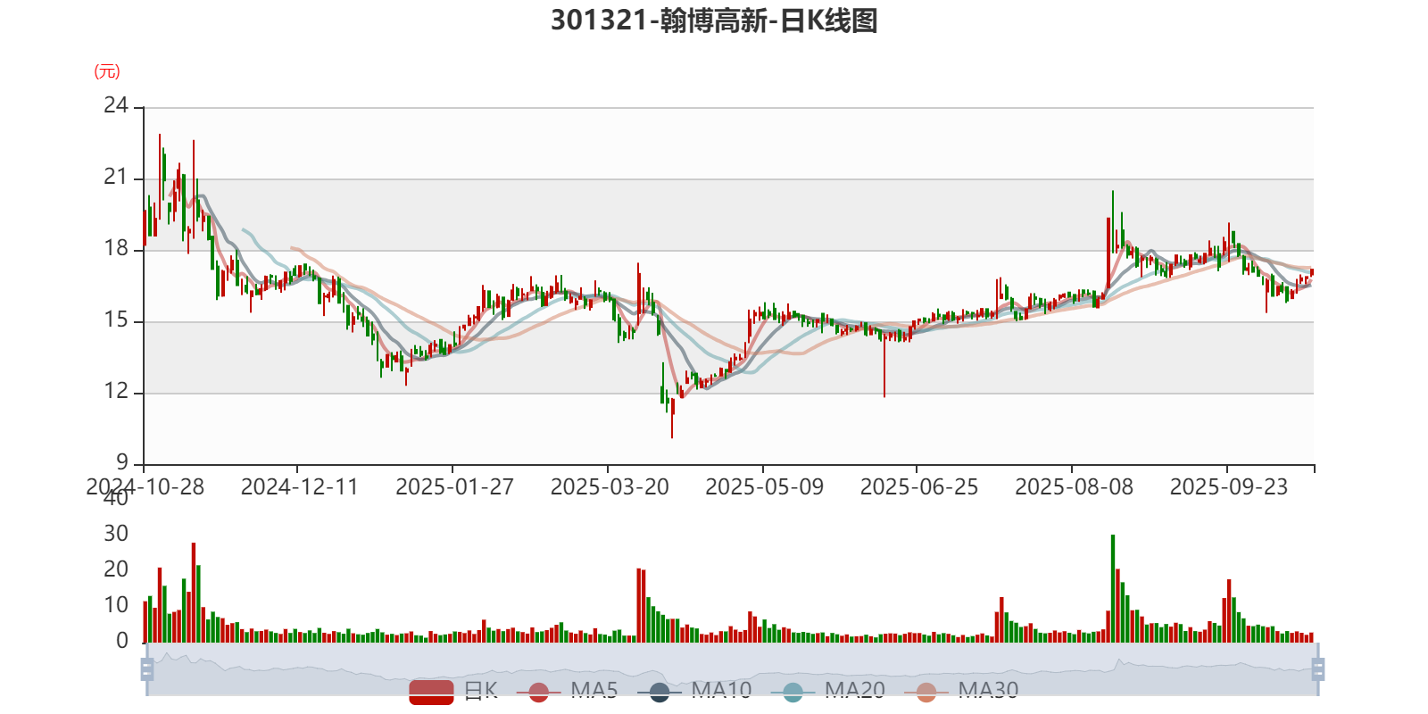 以10月24日收盘价计算,翰博高新目前市盈率(TTM)约为-25.71倍,市净率(LF)约3.29倍,市销率(TTM)约1.04倍。