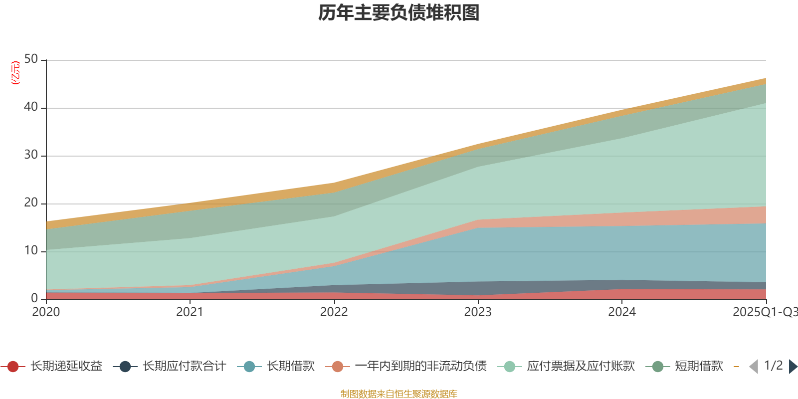 负债重大变化方面,截至2025年三季度末,公司应付票据及应付账款较上年末增加38.77%,占公司总资产比重上升7.63个百分点;短期借款较上年末减少14.91%,占公司总资产比重下降2.03个百分点;长期应付款合计较上年末减少21.89%,占公司总资产比重下降1.05个百分点;一年内到期的非流动负债较上年末增加27.12%,占公司总资产比重上升0.81个百分点。