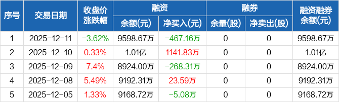 翰博高新:融资净偿还467.16万元,融资余额9598.67万元(12-11)