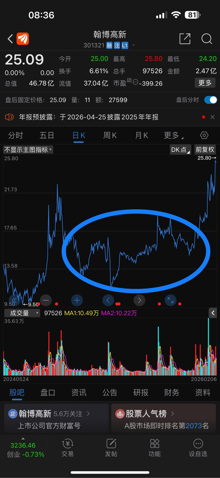 $翰博高新(SZ301321)$ 主力成本在画圈位置,拉高就是出货,不要谢我