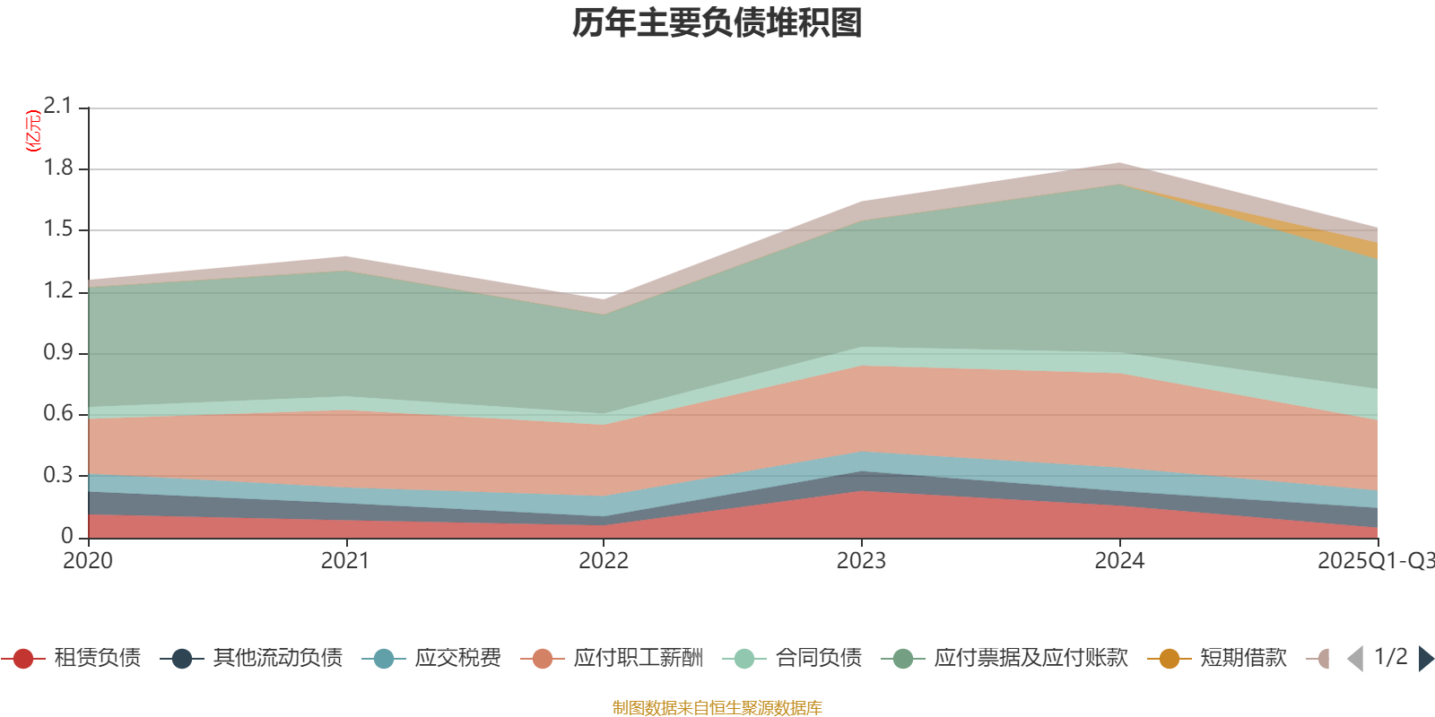 负债重大变化方面,截至2025年三季度末,公司应付票据及应付账款较上年末减少22.72%,占公司总资产比重下降0.86个百分点;应付职工薪酬较上年末减少25.62%,占公司总资产比重下降0.54个百分点;租赁负债较上年末减少68.9%,占公司总资产比重下降0.47个百分点;短期借款占公司总资产的0.34%,上年末为0。