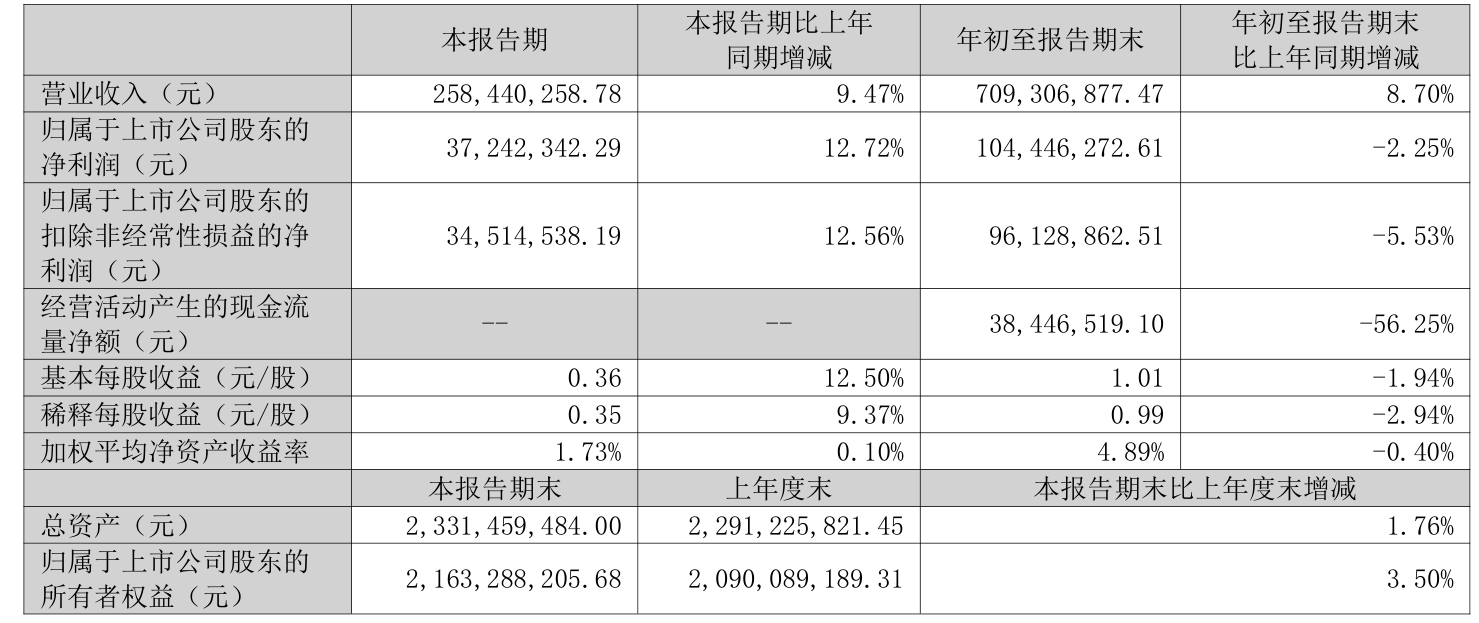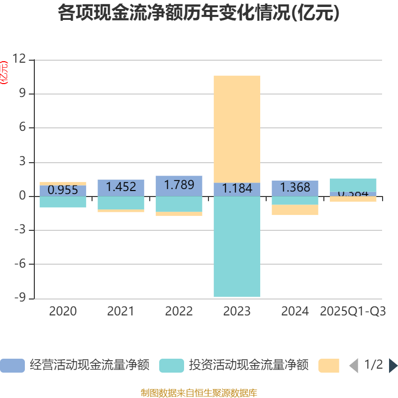 2025年前三季度,公司经营活动现金流净额为3844.65万元,同比下降56.25%;筹资活动现金流净额-4879.93万元,同比增加3825.5万元;投资活动现金流净额1.16亿元,上年同期为-539.64万元。