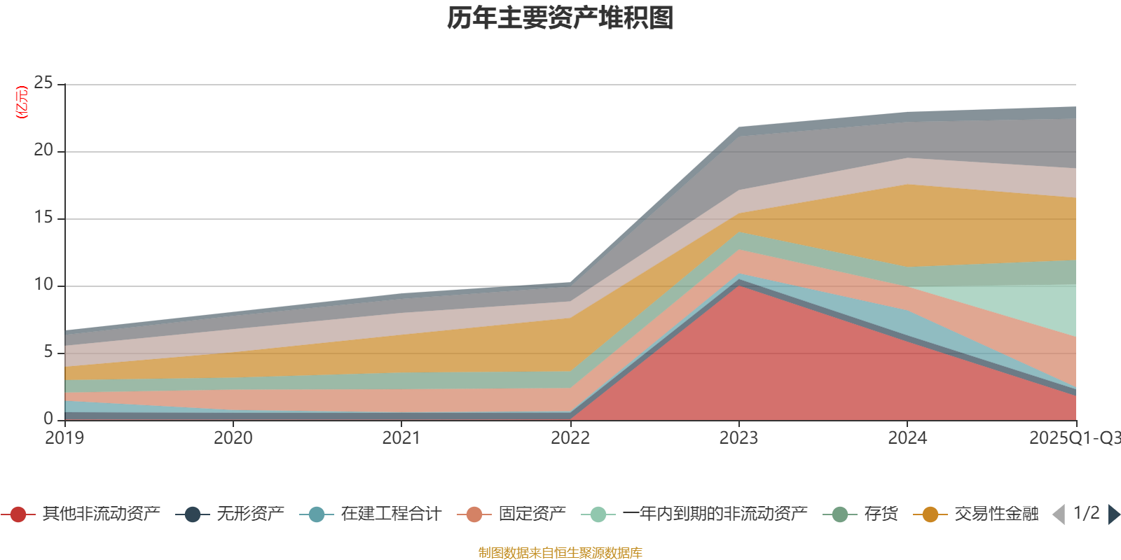 资产重大变化方面,截至2025年三季度末,公司其他非流动资产较上年末减少69.27%,占公司总资产比重下降17.72个百分点;一年内到期的非流动资产占公司总资产的16.72%,上年末为0;固定资产较上年末增加111.33%,占公司总资产比重上升8.33个百分点;在建工程合计较上年末减少91.31%,占公司总资产比重下降7.43个百分点。