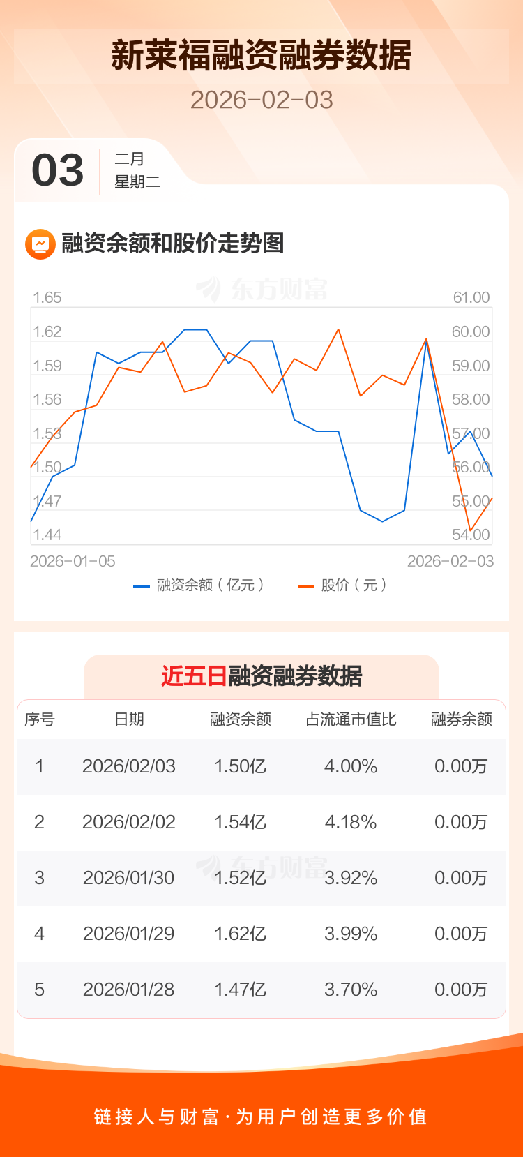 交易所最新数据显示,新莱福于2026年2月3日获融资买入753.76万元,融资偿还1155.64万元,当日融资净偿还401.88万元。目前,该股融资余额1.50亿,占流通市值比例为4.00%。