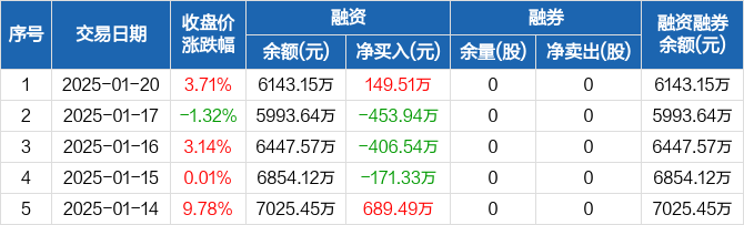 捷邦科技:融资净买入149.51万元,融资余额6143.15万元(01-20)