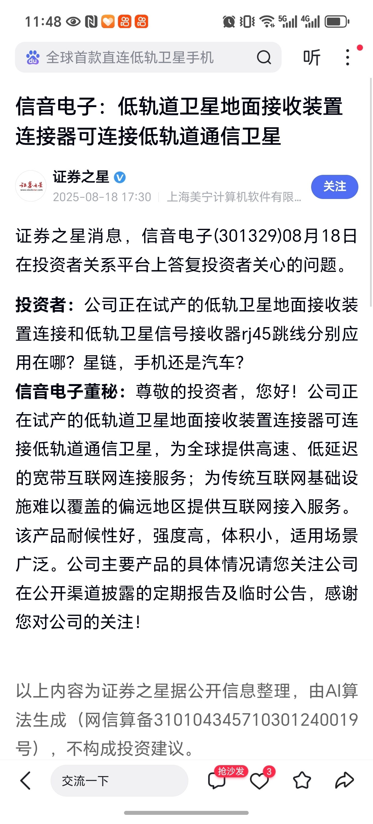 $信音电子(SZ301329)$ 低轨道卫星地面接收装置连接器想象空间够大……