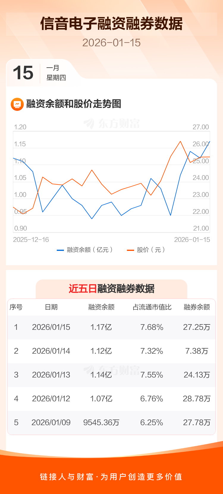交易所最新数据显示,信音电子于2026年1月15日获融资买入2547.59万元,融资偿还1997.25万元,当日融资净买入550.33万元。目前,该股融资余额1.17亿,占流通市值比例为7.68%。