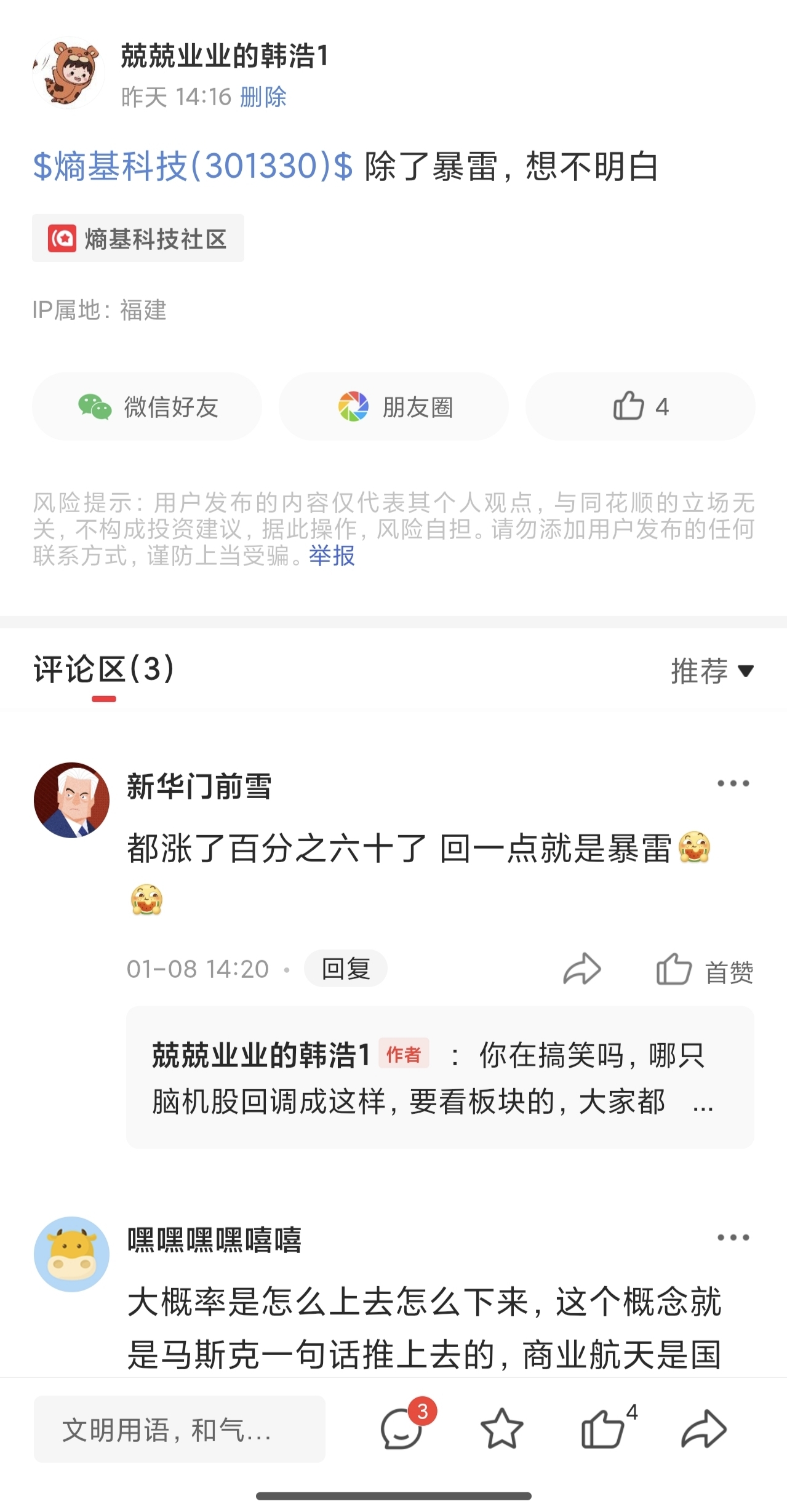 温馨提示: 1.根据《证券法》规定,禁止编造、传播虚假信息或者误导性信息,扰乱证券市场;2.用户在本社区发表的所有资料、言论等仅代表个人观点,与本网站立场无关,不对您构成任何投资建议。用户应基于自己的独立判断,自行决定证券投资并承担相应风险。《东方财富社区管理规定》